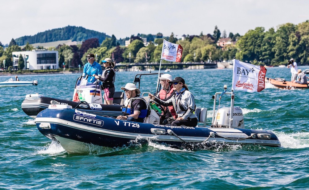 Nicht nur Lindau ist als Austragungsort in diesem Jahr neu, sondern auch die Zusammensetzung der Jury war dieses Mal besonders. Im Rahmen der von World Sailing organisierten Schiedsrichterausbildung zum „International Umpire“ (IU) kamen beim Liga-Event in Lindau (25.-27.05.17) zwölf Teilnehmer aus der ganzen Welt zusammen. Sie übernahmen unter Anleitung eines ligaerfahrenen Umpire drei Tage lang die Steuer der Jury-Motorboote und paukten zwischendurch fleißig die Theorie.