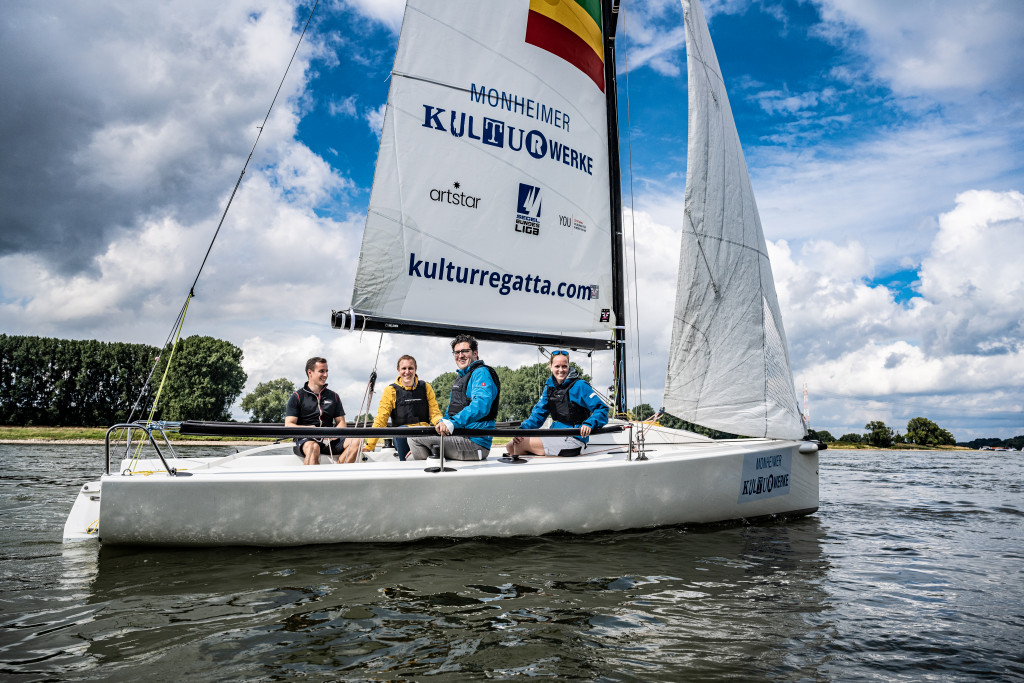 Dreieinhalb Stunden nach dem Startschuss durch den Künstler Stefan Szczesny vor der Kulturraffinerie K714 in Monheim erreichte die Kultur-Regatta ihr Ziel im Düsseldorfer Yachtclub. Die rund 30 Kilometer rheinabwärts zwischen Monheim und Düsseldorf werden nicht nur der Veranstalter, sondern auch die Segler:innen der Segel-Bundesliga nicht so schnell vergessen. Strahlende Gesichter über Windbedingungen von durchschnittlich zwölf Knoten ließen die Kunstaustellung stellenweise doch zu einer Segel-Regatta mit sportlichem Ehrgeiz werden – zur Freude der Zuschauer:innen am Rheinufer.