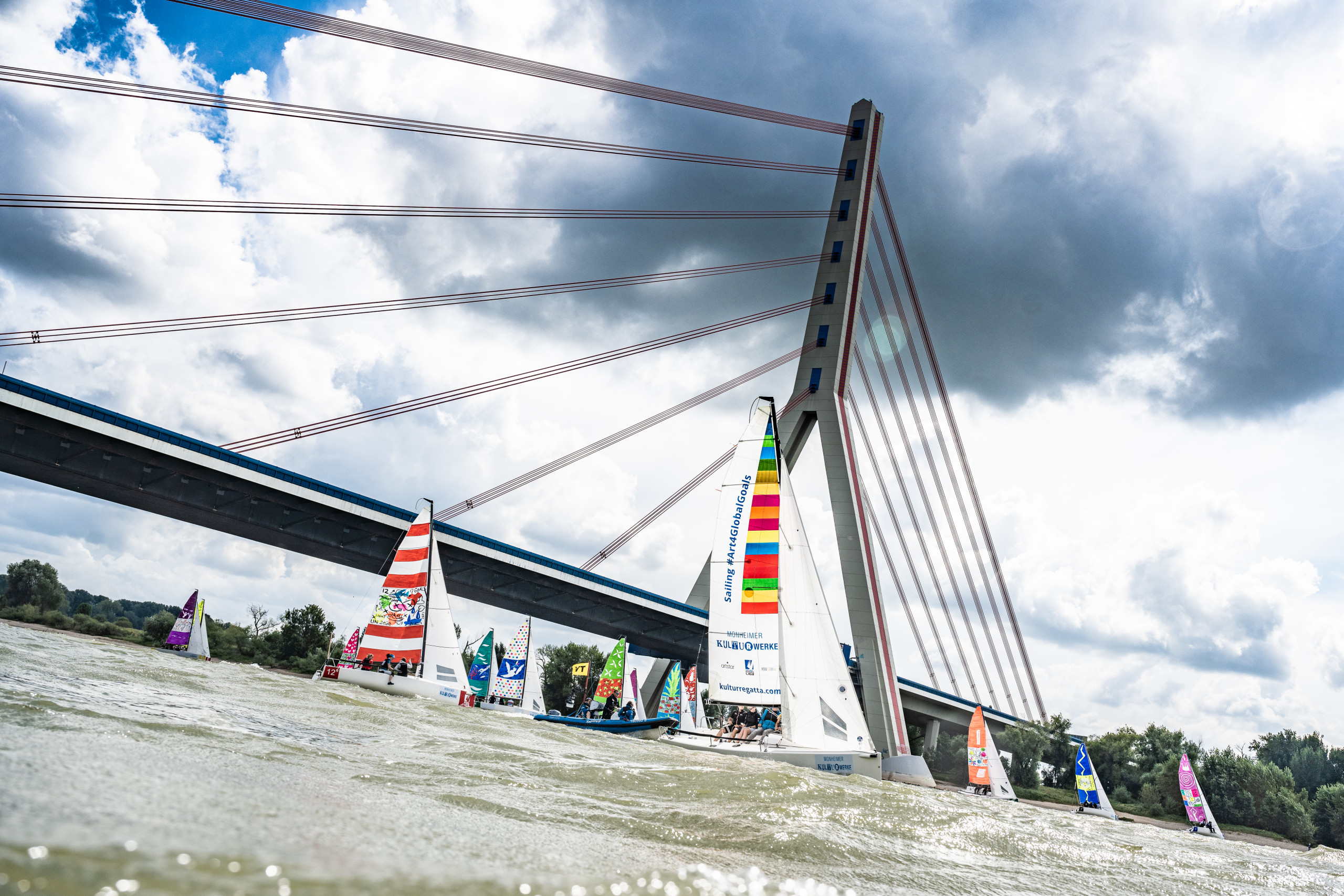 Dreieinhalb Stunden nach dem Startschuss durch den Künstler Stefan Szczesny vor der Kulturraffinerie K714 in Monheim erreichte die Kultur-Regatta ihr Ziel im Düsseldorfer Yachtclub. Die rund 30 Kilometer rheinabwärts zwischen Monheim und Düsseldorf werden nicht nur der Veranstalter, sondern auch die Segler:innen der Segel-Bundesliga nicht so schnell vergessen. Strahlende Gesichter über Windbedingungen von durchschnittlich zwölf Knoten ließen die Kunstaustellung stellenweise doch zu einer Segel-Regatta mit sportlichem Ehrgeiz werden – zur Freude der Zuschauer:innen am Rheinufer.